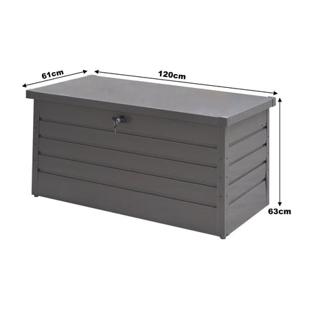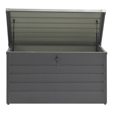 Say goodbye to clutter with this metal garden storage box. This versatile storage solution boasts a substantial capacity of 350L, offering plenty of room to stow away various outdoor items. Thanks to the heavy-duty hinges, opening and closing the box is a breeze, which allows effortless access to your stored belongings. To ensure the contents remain secure, it is designed with a twist grip cylinder lock, giving you peace of mind.