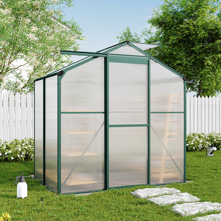 A perfect home for your lovely flowers and plants in the garden, this garden greenhouse features gable rooftops and rain gutters to allow rainwater to drop down easily providing a perfect drainage solution to protect your plants inside. This outdoor greenhouse has 2 adjustable vents on the roof that provide your flowers with perfect air circulation and maintains a perfect humidity level inside the greenhouse. This greenhouse is built with an aluminium alloy frame with a green finish and transparent panels to provide enough sunlight for your plants and flowers.