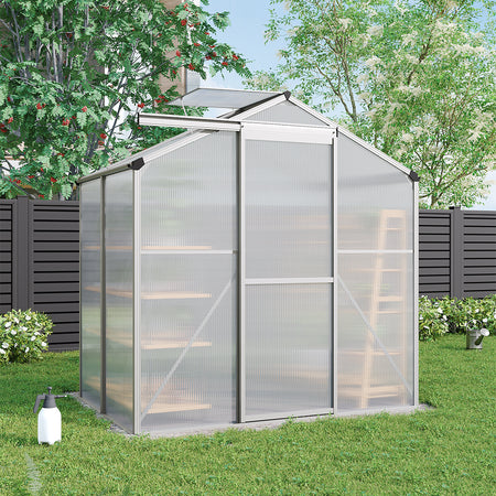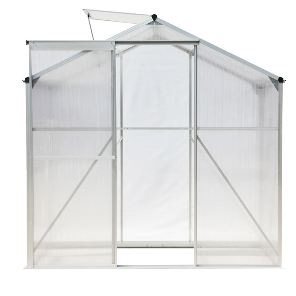 This frame of this practical greenhouse is built from superior aluminium, which lays the foundation of the upright and sturdy structure. The polycarbonate-made panels are semi-transparent, which allows you to check on the plants from time to time. To make sure that the inner environment is in the best condition, the greenhouse is paired with a window opening. An impressive greenhouse for a planting lover like you.